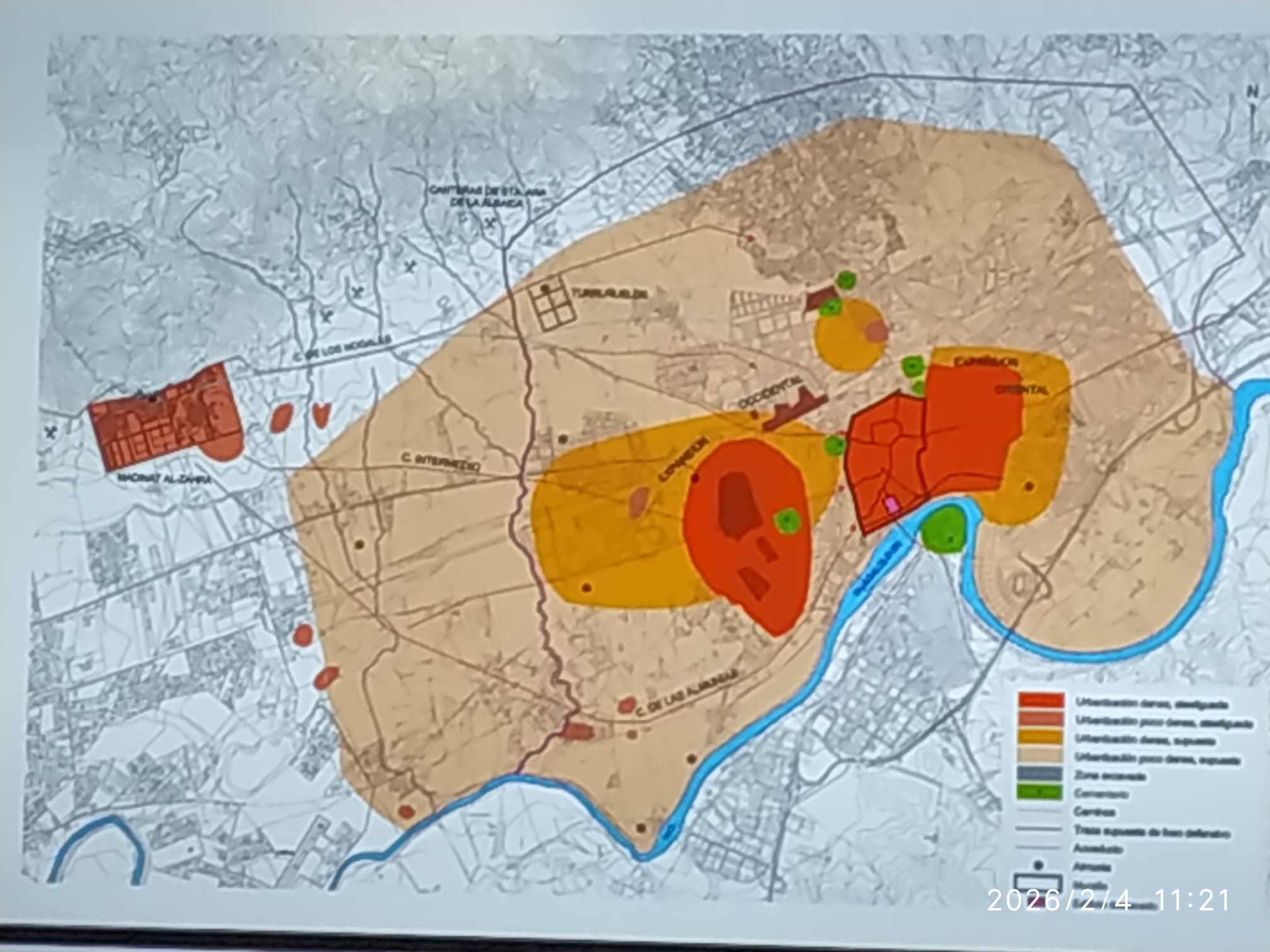 Antonio Vallejo pasó a narrarnos brevemente la cronología desde la construcción a la caída de la ciudad: El inicio data del 936 d.C. El año 942 pavimentaron la calzada que unía la almunia de la noria con el nuevo palacio. El año 945 finalizó la mezquita aljama. El 947 se procedió al traslado de la «Ceca» (la casa de la moneda) y de las infraestructuras estatales entonces en Córdoba. También se instaló el Califa en el alcázar de la nueva ciudad. El denominado Salón Rico (Salón de «Abd al-Rahman III») se construyó entre los años 953-4 y 956-7. De 1009 a 1013 se inició la distribución de la ciudad. Los califas implicados fueron: Abd al-Rahman III, Al-Hakam II e Hisam II.
