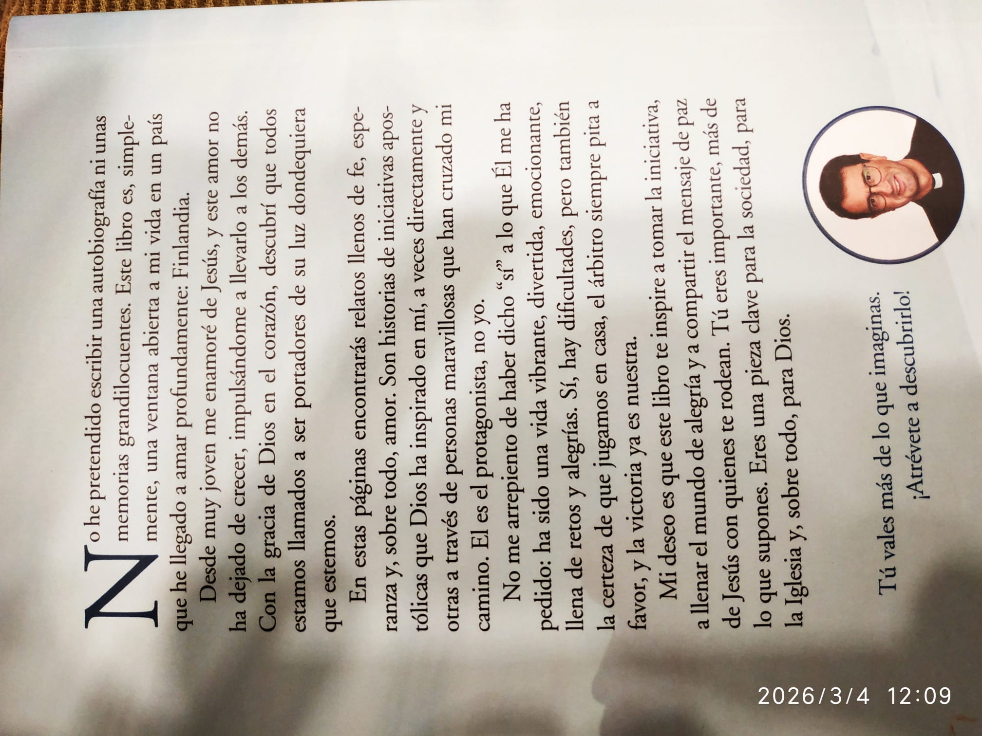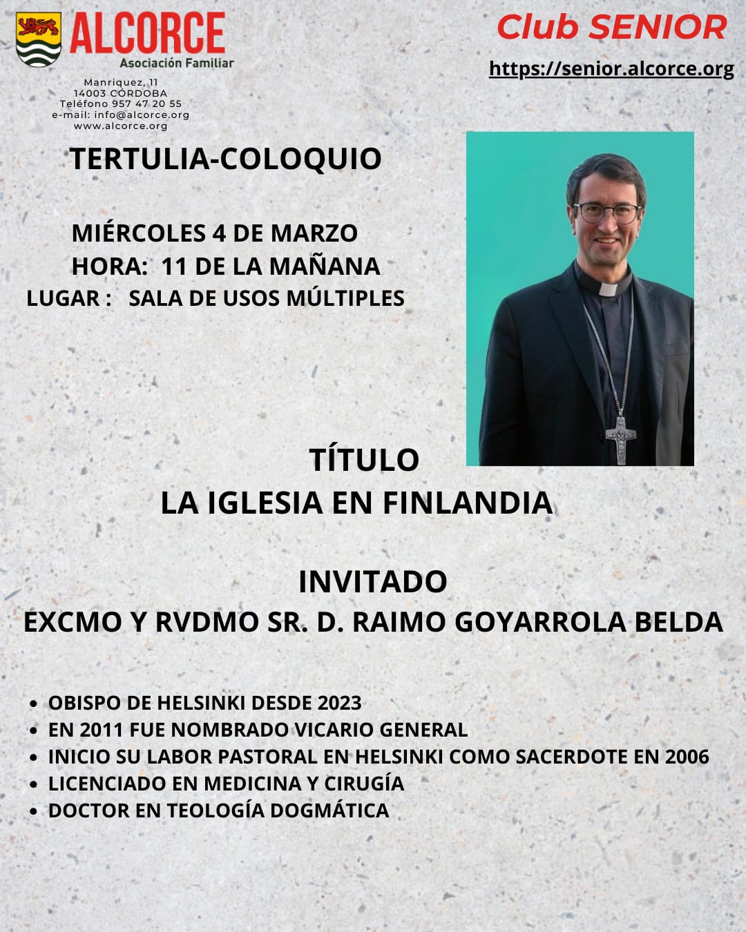 Hoy, miércoles 4-mar-2026, hemos tenido una nueva charla-coloquio en Alcorce, esta vez una tertulia con el señor Obispo de la diócesis de Finlandia: don Raimo Goyarrola Belda, sobre: La Iglesia en Finlandia. El acto tuvo lugar en el salón multiusos de Alcorce. Antonio Arrabal hizo una breve presentación, poco más que leer el curriculum del ponente: Obispo de Helsinki desde 2023. En 2011 fue nombrado Vicario General. Inició su labor pastoral en Helsinki como sacerdote en 2006. Es licenciado en Medicina y Cirugía y Doctor en Teología dogmática. Dijo además que esta es la primera parada de don Raimo en Córdoba y no va a poder estar muchos minutos con nosotros, porque inmediatamente después se va al colegio Ahlzahir. Comentó que hemos comprado un libro suyo: «Romper el hielo. Historias de un sacerdote católico en Finlandia». En la contraportada, escribe al final: «Tú vales más de lo que te imaginas. ¡Atrévete a descubrirlo!». Su hija sabe más que él sobre don Raimo, está impresionada. Su lema episcopal es «Servir a Dios con alegría». Si no fuera de Bilbao, no podría haber hecho tanto, afirmó Antonio, jocoso.
