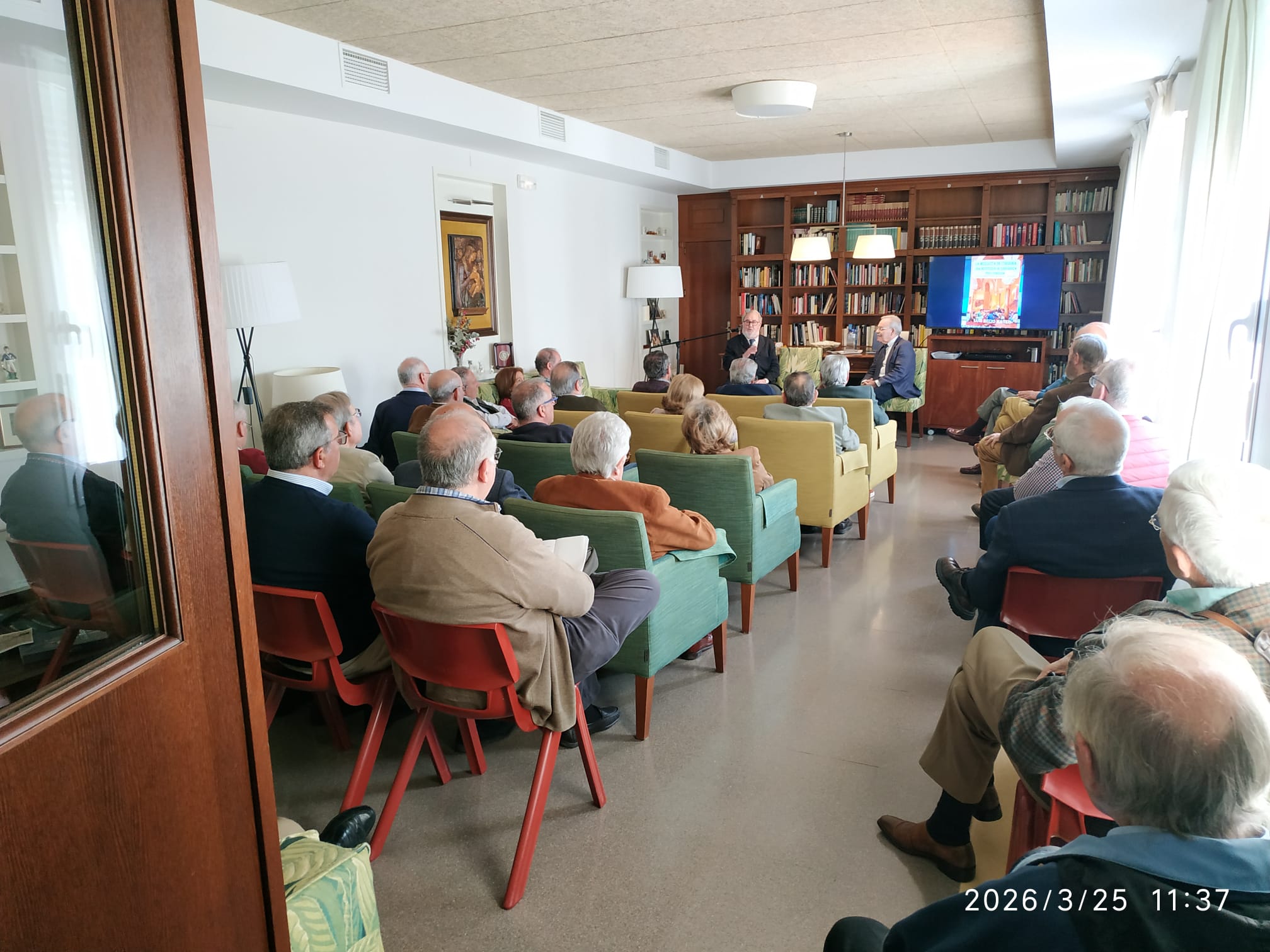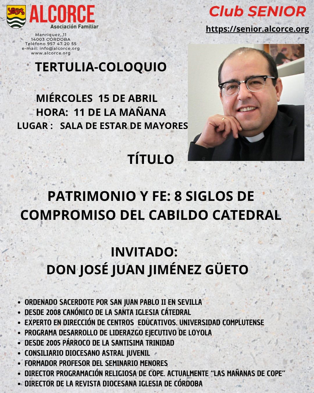 El miércoles 15-abr-2026 hemos tenido una nueva charla-coloquio en Alcorce, esta vez con don José Juan Jiménez Güeto, sobre Patrimonio y fe: 8 siglos de compromiso del Cabildo Catedral. El acto tuvo lugar en la sala de estar de mayores de Alcorce. Antonio Arrabal presentó al ponente, destacando algunos aspectos de su currículum, recogidos en el cartel.
