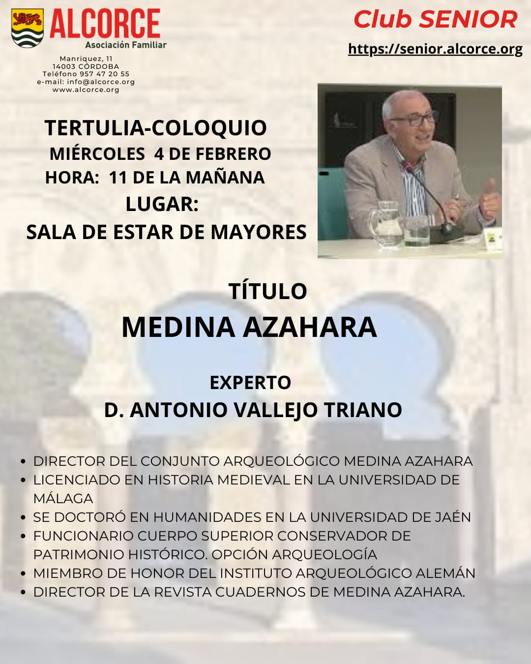 Hoy, miércoles 04-feb-2026, ha venido a tener con nosotros una interesante tertulia Antonio Vallejo Triano. Nos ha hablado acerca de «Medina Azahara». Como es habitual, la presentación del ponente corrió a cargo de Antonio Arrabal, quien comentó brevemente su currículum: Director del conjunto arqueológico Medina Azahara. Licenciado en Historia Medieval en la Universidad de Málaga. Se doctoró en Humanidades en la Universidad de Jaén. Funcionario del Cuerpo Superior Conservador de Patrimonio Histórico, opción Arqueología. Miembro de honor del Instituto Arqueológico Alemán. Director de la revista «Cuadernos de Medina Azahara». Más tarde, Antonio Arrabal nos comentó que la charla ha sido «estratosférica». Sencilla, sin alharacas, «cimentada sobre una vida de estudio inteligente. Excelente la transmisión oral. Otro modelo». Por su parte, Luis Recio, guía oficial de la Catedral, antes Mezquita, nos esbozó que el 3 de mayo de 2001 estaba él con el ponente en la inauguración de la exposición de los Omeyas y nos contó una conocida anécdota al respecto.