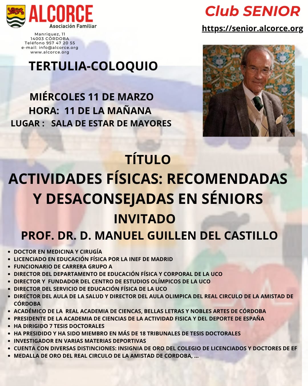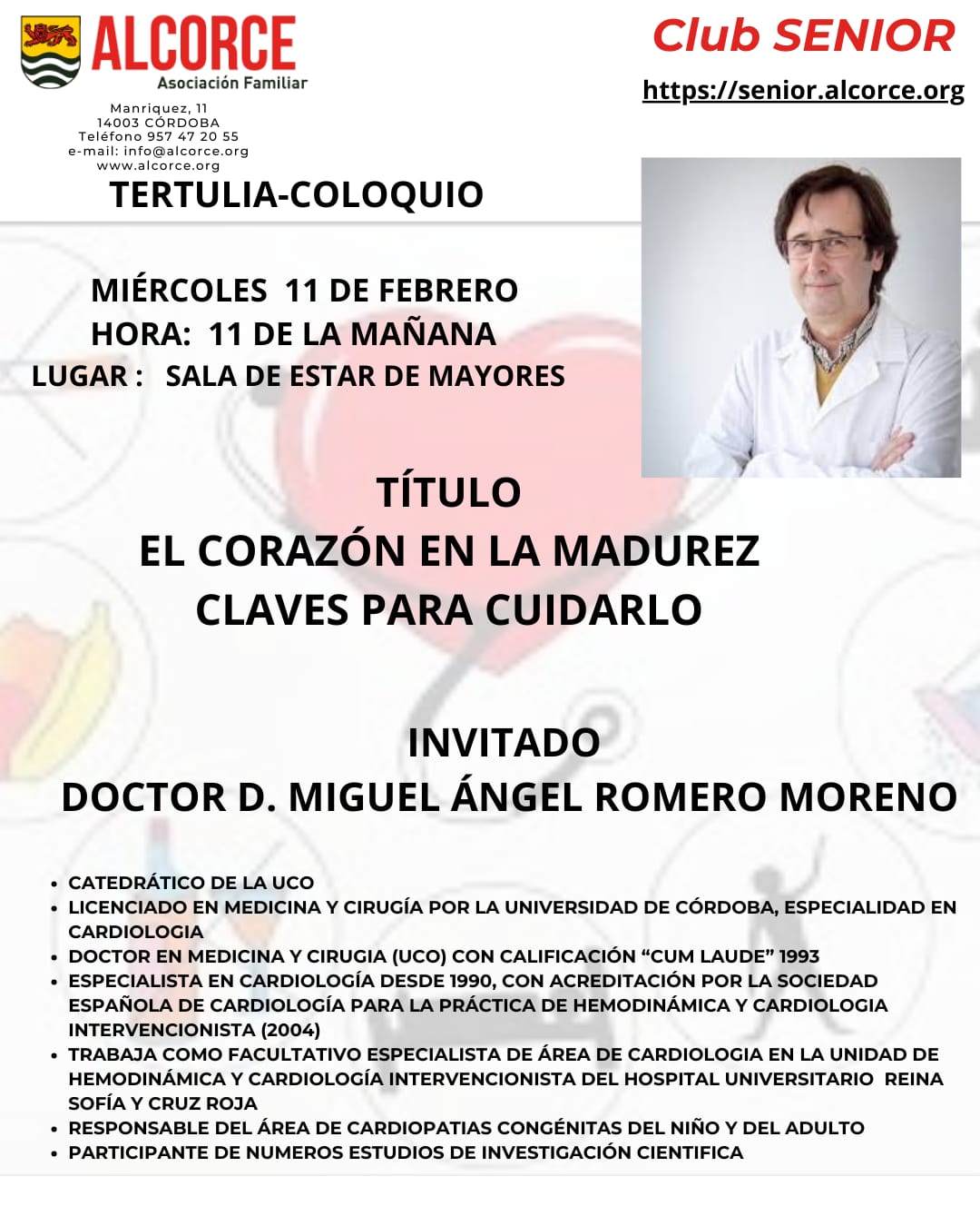 Hoy, miércoles 11-feb-2026, hemos tenido una nueva charla-coloquio en Alcorce, esta vez con el Dr. Miguel Ángel Romero Moreno, sobre: El corazón en la madurez, claves para cuidarlo. El acto tuvo lugar en la sala de estar de mayores. Antonio Arrabal hizo una breve presentación, poco más que leer el curriculum del ponente: Catedrático de la UCO. Licenciado en medicina y cirugía por la Universidad de Córdoba, especialidad en Cardiología. Doctor en Medicina y Cirugía por la UCO con calificación cum laude en 1993. Especialista en Cardiología desde 1990 con acreditación por la Sociedad Española de Cardiología para la práctica de Hemodinámica y Cardiología intervencionista (2004). Trabaja como facultativo especialista de área de cardiología en la unidad hemodinámica y cardiología intervencionista del Hospital Universitario Reina Sofía y Cruz Roja. Responsable del área de cardiopatías congénitas del niño y del adulto. Participante en numerosos estudios de investigación científica. 'Dijo que Miguel Ángel es una persona muy sencilla muy alegre, de espíritu joven, y un personaje que es una eminencia internacional.