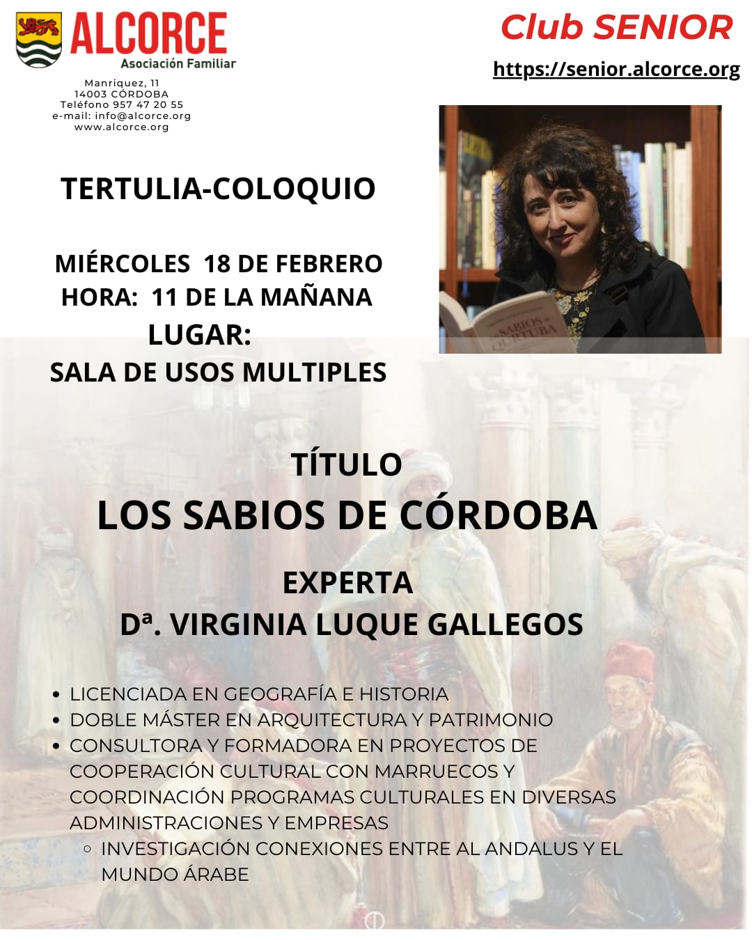 Hoy, miércoles 19-feb-2026, hemos contado con la presencia de Virginia Luque Gallegos, que nos habló de Los sabios de Córdoba. Como es habitual, la presentación corrió a cargo de Antonio Arrabal. Antonio la presentó como una historiadora e investigadora con unas ganas de vivir impresionantes, diciéndonos que nos iba a leer un poquito el historial profesional de Virginia, apasionante y extensísimo, que iba a hacer alguna reseña nada más de su último libro, que él ha comprado, porque de lo contrario se comería prácticamente el tiempo que ella tiene para exponer el tema y contestar preguntas.- Virginia Luque Gallegos es una gestora cultural e historiadora española con una amplia trayectoria en el ámbito de la gestión cultural y el patrimonio histórico. Máster en Arquitectura y Patrimonio Histórico. Postgrado en Interpretación del Patrimonio y Turismo Cultural. Consultora y formadora en Gestión Cultural y Desarrollo en Andalucía. Miembro de la Junta Directiva y Coordinadora de Formación de la Asociación de Gestores Culturales de Andalucía. Redactora de estudios técnicos, planes directores y estratégicos para bienes culturales. Ha trabajado en Proyectos de Cooperación Cultural transfronteriza con Marruecos y en la coordinación de programas culturales europeos. Ha publicado más de una decena de trabajos en revistas y medios de comunicación. Es autora del libro «El legado de al-Andalus. La herencia andalusí y morisca en el Magreb». Su última publicación ha sido «Los sabios de Qurtuba». Cuando la capital de al-Andalus alumbró al mundo. En cuanto a reconocimientos, es Miembro de la Red de Expertos en Patrimonio Cultural y Natural del Campus de Excelencia Internacional. Forma parte de la Sociedad Española de Estudios Árabes (SEEA).