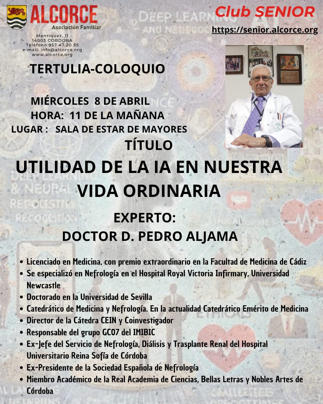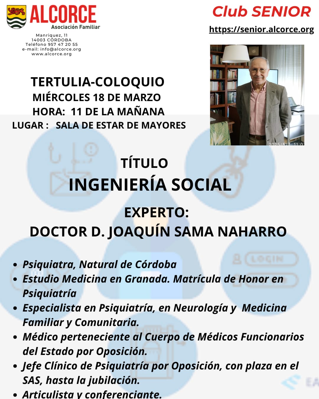 El miércoles 18-mar-2026 hemos tenido una nueva charla-coloquio en Alcorce, esta vez con el doctor Joaquín Sama Naharro, sobre Ingeniería social. El acto tuvo lugar en la sala de estar de mayores de Alcorce. Antonio Arrabal presentó al ponente, destacando algunos aspectos de su currículum: Es natural de Córdoba. Estudió medicina en Granada. Matrícula de honor en psiquiatría. Especialista en psiquiatría, neurología y medicina familiar y comunitaria. Médico perteneciente al Cuerpo de Médicos Funcionarios del Estado, por oposición. Jefe clínico de psiquiatría, por oposición, con plaza en el SAS, hasta la jubilación. Articulista y conferenciante. Antonio resaltó la amabilidad de Joaquín y afirmó que la amabilidad es lo único que puede cambiar el mundo. «Con gestos amables se construye un entorno donde vale la pena estar», afirmó.