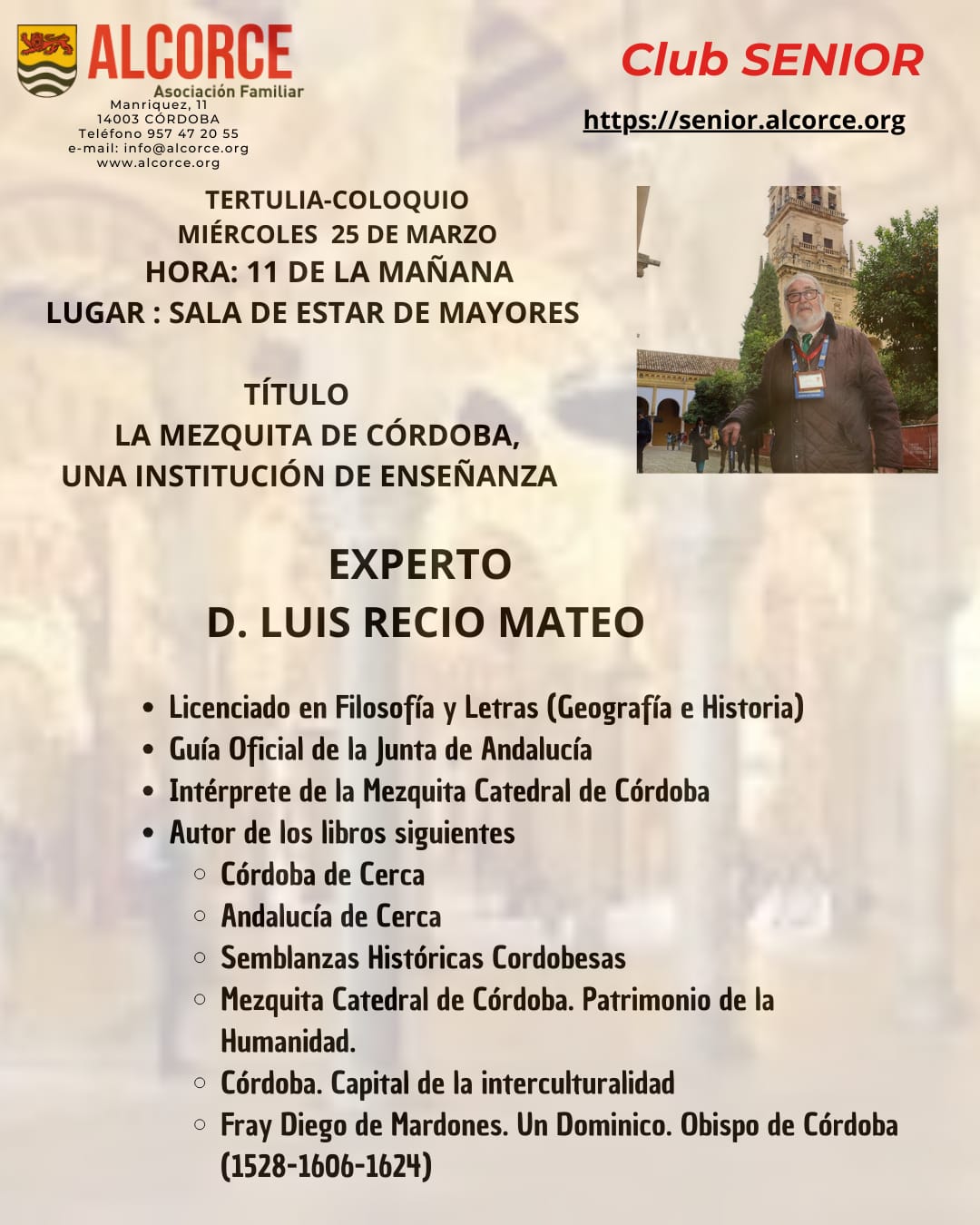 El miércoles 25-mar-2026 hemos tenido una nueva charla-coloquio en Alcorce, de nuevo con Luis Recio Mateo, sobre La Mezquita de Córdoba, una institución de enseñanza. El acto tuvo lugar en la sala de estar de mayores de Alcorce. Antonio Arrabal presentó al ponente, destacando algunos aspectos de su currículum, recogidos en el cartel.