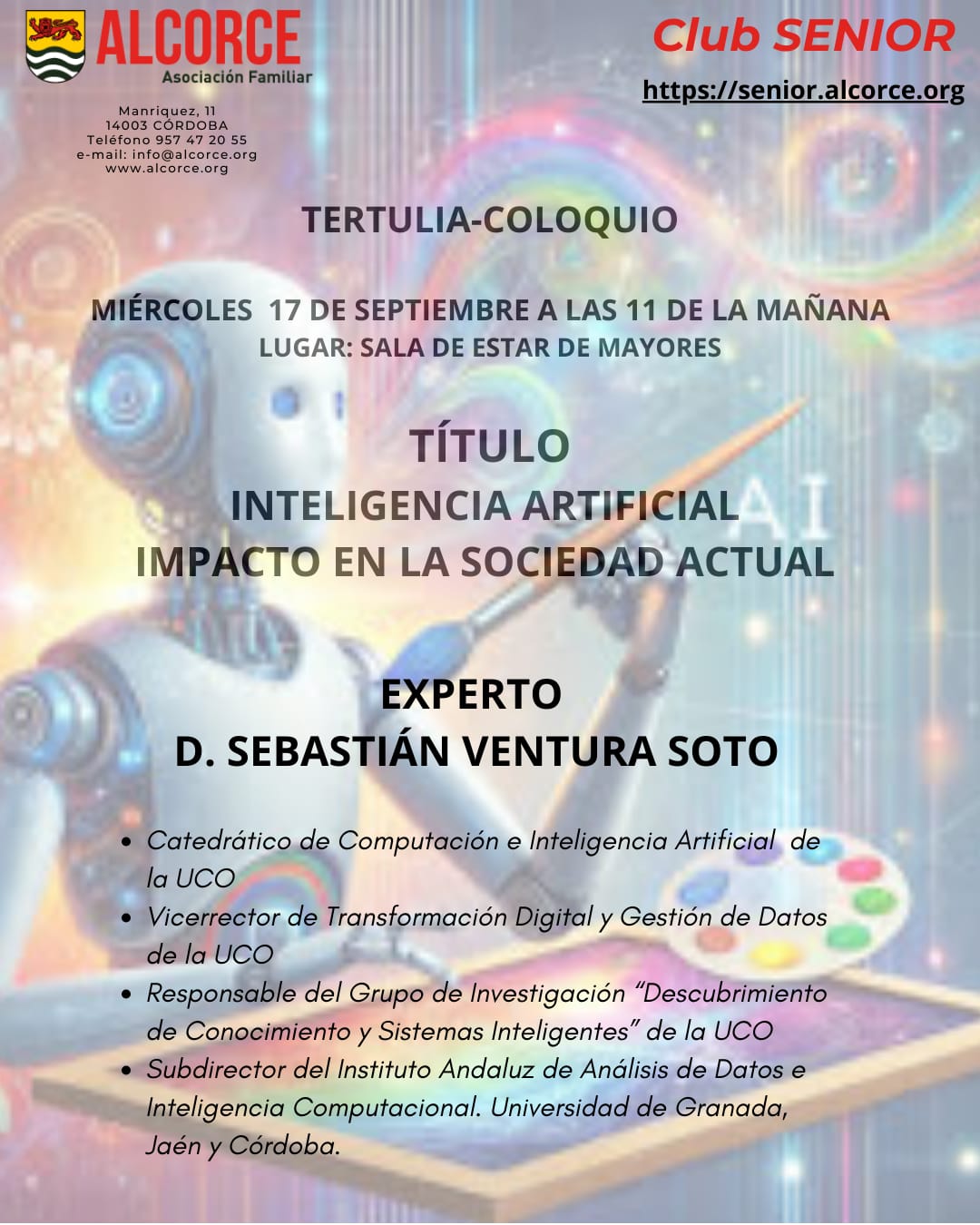 Hoy, miércoles 17 de septiembre, reanudamos tras el paréntesis estival las tertulias-charlas-coloquio semanales del club senior de la asociación familiar Alcorce. Se ha invitado al profesor Sebastián Ventura Soto, para hablarnos de «Inteligencia Artificial: impacto en la sociedad actual».