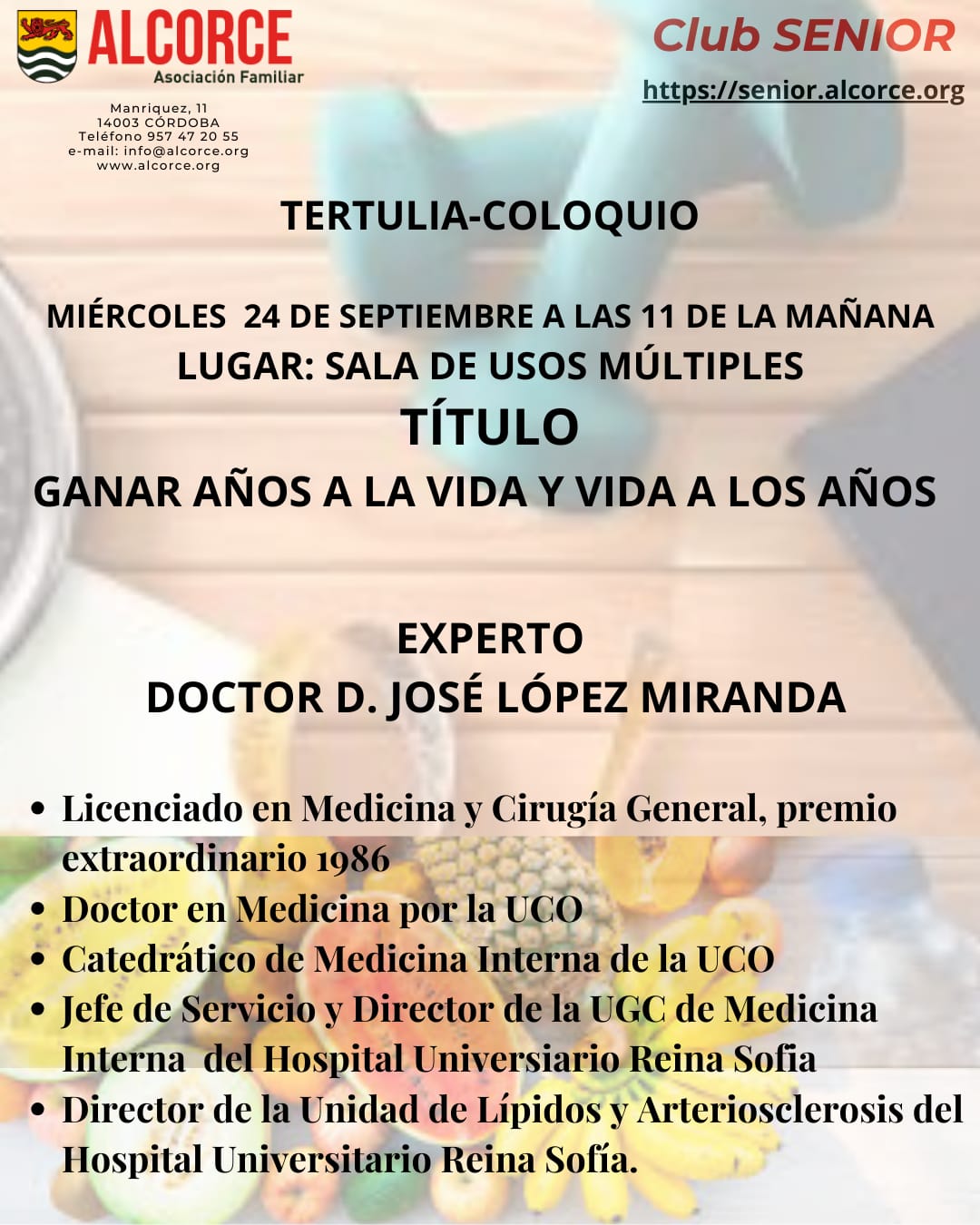 Hoy, miércoles 24 de septiembre, a la charla-coloquio semanal del club senior de la Asociación Familiar Alcorce, se ha invitado al doctor José López Miranda, para hablarnos de «Ganar años a la vida y vida a los años».