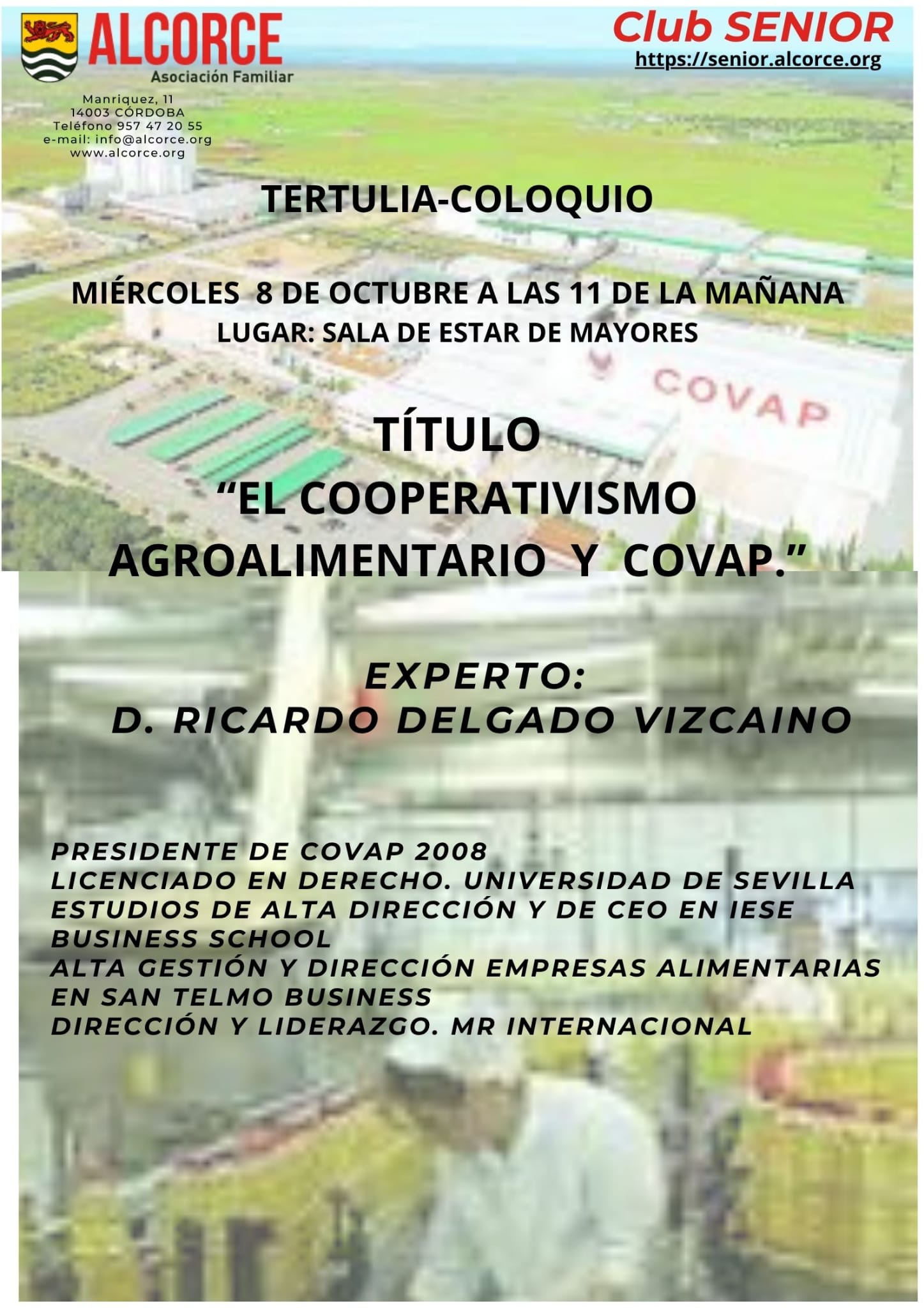 Hoy, miércoles 8 de octubre, a la charla-coloquio semanal del club senior de la Asociación Familiar Alcorce, se ha invitado al empresario Ricardo Delgado Vizcaíno, para hablarnos de «El cooperativismo agroalimentario y Covap».